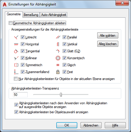 Steuert die Anzeige von geometrischen Abhängigkeiten in Abhängigkeitenleisten