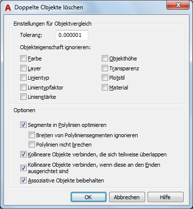 Wenn diese Option ausgewählt ist, werden einzelne Linien- und Bogensegmente in ausgewählten Polylinien untersucht. Doppelte Scheitelpunkte und Segmente werden entfernt.