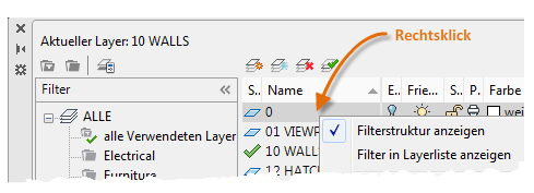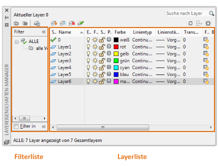 Zeigt eine Liste der Layerfilter für die Zeichnung an. Klicken Sie auf zum Erweitern oder Ausblenden der Filterliste. Wenn die Filterliste ausgeblendet ist, verwenden Sie die Schaltfläche Layerfilter (