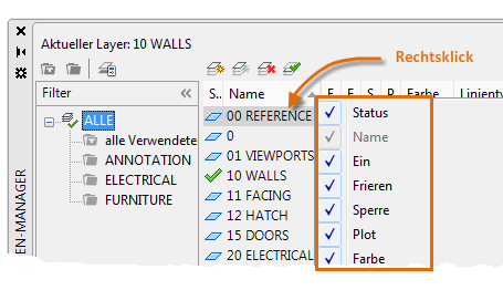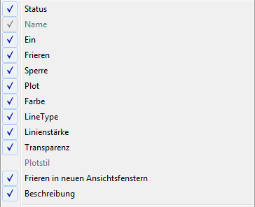 Führt die Namen aller Spalten auf. Ein Häkchen gibt an, dass die Spalte angezeigt wird. Klicken Sie zum Anzeigen oder Ausblenden der Spalte auf einen Spaltennamen. AF Frieren, AF Farbe, AF Linientyp, AF Linienstärke und AF Plotstil sind nur verfügbar, wenn ein Layout-Ansichtsfenster aktiv ist.