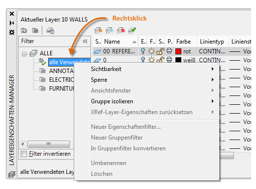 Entfernt den ausgewählten Layerfilter. Die Layerfilter Alle, Alle verwendeten Layer und XRef können nicht gelöscht werden.