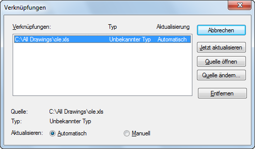 Trennt die Verknüpfung zwischen dem Objekt und der Originaldatei. Das Objekt in Ihrer Zeichnung wird in eine Windows-Metadatei geändert, auf die spätere Änderungen der Quelldatei keinen Einfluss haben.