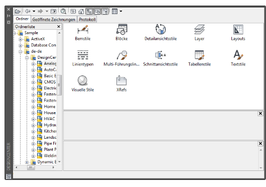 Verwenden Sie die Strukturansicht auf der linken Seite, um die Inhaltsquellen zu durchsuchen und den Inhalt im Inhaltsbereich auf der rechten Seite anzuzeigen. Im Inhaltsbereich können Sie einer Zeichnung oder einer Werkzeugpalette Elemente hinzuzufügen. Für ausgewählte Zeichnungen, Blöcke, Schraffuren oder XRefs wird eine Vorschau oder Beschreibung angezeigt.