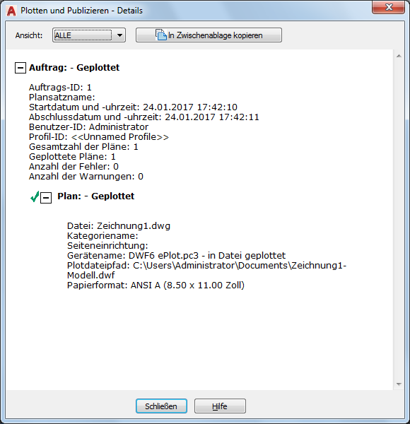 Führt Details zu den abgeschlossenen Plot- und Publizieraufträgen auf.