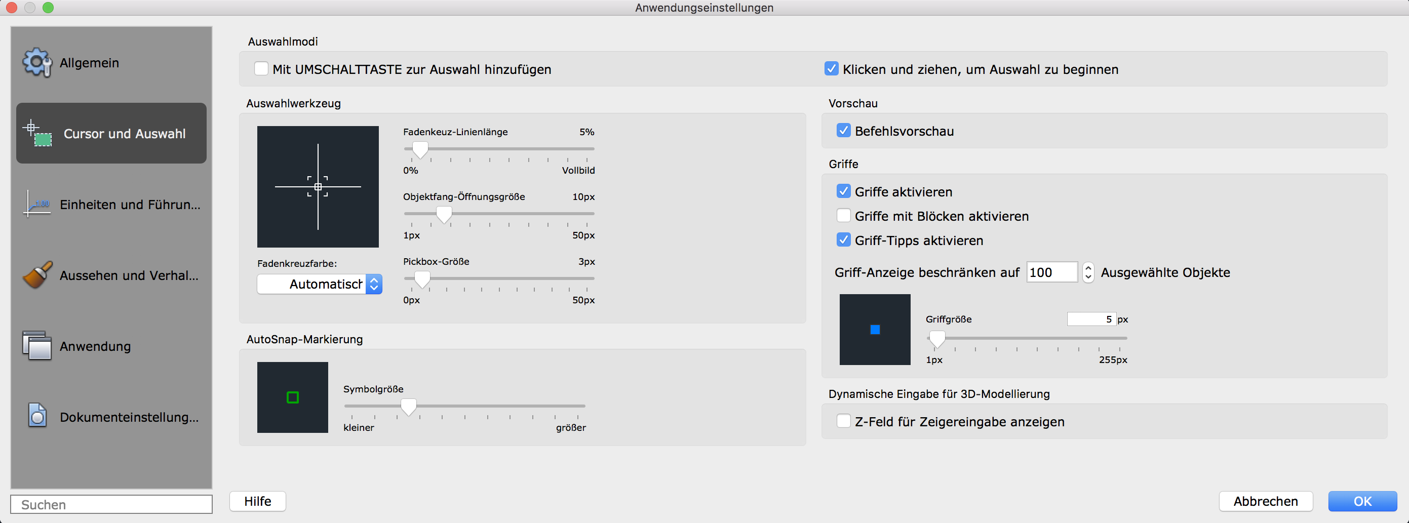 Steuert die Farbe von Fadenkreuz, Objektfang-Öffnung und Pickbox im Zeichenbereich. Automatisch ist die Vorgabefarbe.