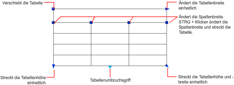 Wenn Sie die Höhe oder Breite der Tabelle ändern, ändert sich nur die Zeile oder Spalte neben dem Griff, den Sie ausgewählt haben. Die Tabelle selbst behält ihre Höhe bzw. Breite. Um die Größe einer Tabelle proportional zu der Größe der Zeile oder Spalte, die Sie bearbeiten, zu ändern, drücken Sie die STRG-Taste, während Sie einen Spaltengriff verwenden.