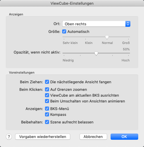 Wendet die Standardeinstellungen für das ViewCube-Werkzeug an.