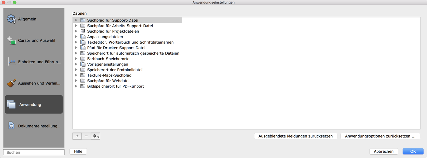 Führt die Ordner auf, in denen das Programm nach Support-, Treiber-, Menü- und anderen Dateien sucht. Darüber hinaus werden einige optionale, benutzerdefinierte Einstellungen aufgeführt, beispielsweise das Wörterbuch für die Rechtschreibprüfung.