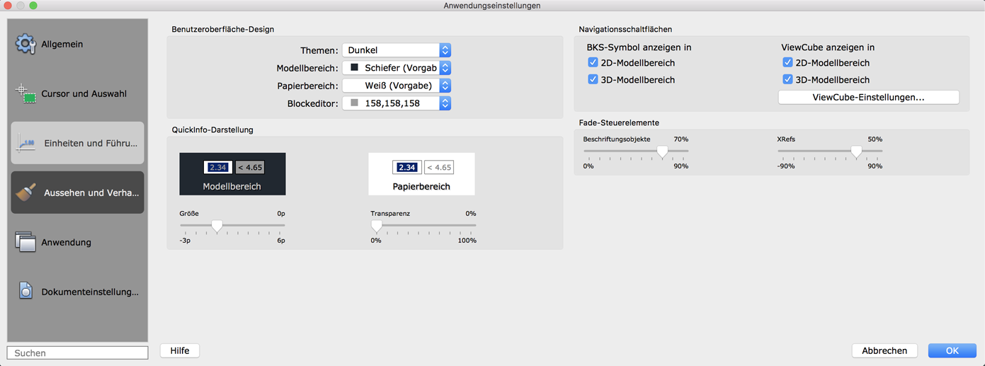 Steuert, welches Thema für Elemente wie beispielsweise Statusleiste, Paletten und Zeichnungsfenster angewendet werden soll. Sie können zwischen dunklen oder hellen Themen wählen.