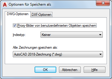 Anmerkung: Wenn Sie eine teilweise geöffnete Zeichnung speichern, die noch keine Layer- und Raumindizes enthält, ist diese Option deaktiviert.