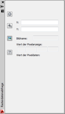 Gibt weitere Datenwerte der Pixel unter dem Cursor an. Die Werte hängen vom Bildtyp ab. Ein Indexfarben- oder Graustufenbild kann z. B. die Werte 0-255 haben. Wenn das Bild im 32-Bit-Gleitkommaformat mit Palettenfarbkarte vorliegt, kann es sich bei den Daten hier je nach Farbkarte um Erhebung, Neigung oder Aussehen handeln.