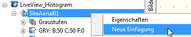 | 6 | Sie können weitere Kopien des Bilds einfügen, wenn Sie andere Histogramm-Steuerelemente zum Bearbeiten des Bilds ausprobieren möchten. Vergewissern Sie sich vorher, dass der Bild-Manager geöffnet ist (wählen Sie ggf. Raster Verwalten). Klicken Sie in der Ansicht Bilddaten mit der rechten Maustaste auf den Bildnamen, und klicken Sie auf Neue Einfügung.