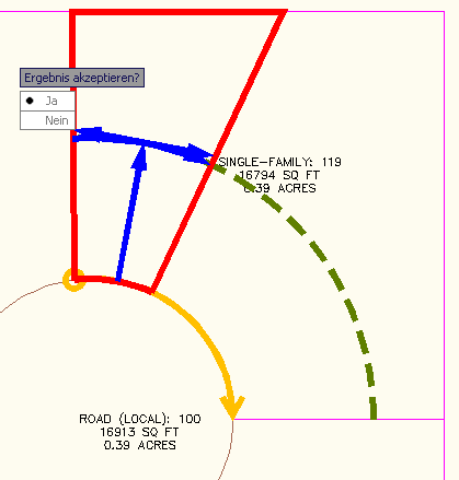 - Die Vorschau der Grafiken wird angezeigt, wenn die vorgeschlagene Lösung richtig ist. Die grüne gestrichelte Linie stellt den Straßenfront-Versatz dar (siehe Abbildung 8). Nehmen Sie die resultierende Lösung an, oder geben Sie Nein ein, um den Befehl zu beenden, damit Sie die Größenanpassungsparameter einstellen können.