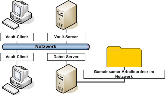 Werden die Arbeitsordner auf lokalen Computern gespeichert (siehe Abbildung 7), wird der Datenverkehr im Netzwerk minimiert, und es werden auch Teammitglieder unterstützt, die offline vor Ort oder von zu Hause aus arbeiten. Lediglich beim Ein- und Auschecken von Dateien durch Benutzer nimmt der Datenverkehr im Netzwerk zu.