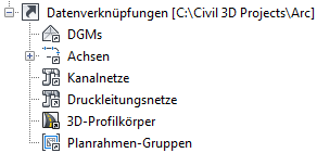 Datenverknüpfungen können nur für DGMs, Achsen, Längsschnitte, 3D-Profilkörper, Kanalnetze, Druckleitungsnetze und Planrahmen-Gruppen erstellt werden. Sie dienen als Referenzverknüpfungen zwischen Zeichnungen ohne Verwendung einer Datenbank. Wenn Sie aus einer Zeichnung Datenverknüpfungen erstellen, werden diese im Knoten Datenverknüpfungen der Übersichtsstruktur angezeigt. Von dieser Stelle aus können Sie ein Referenzobjekt in eine weitere geöffnete Zeichnung einfügen, indem Sie mit der rechten Maustaste auf seine Verknüpfung klicken oder indem Sie die Verknüpfung durch Ziehen und Ablegen in die aktuelle Zeichnung einfügen.