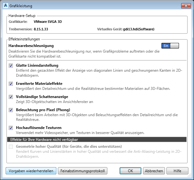 Außerdem können Sie durch Eingabe des Befehls -GRAFIKKONFIG in der Befehlszeile auf weitere Optionen zugreifen. Weitere Informationen erhalten Sie in der AutoCAD-Hilfe.