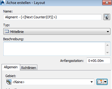Wenn Sie in den Dialogfeldern Achse erstellen oder Achse erstellen - Aus Polylinie eine Achse erstellen, wird standardmäßig eine Achse ohne festgelegtes Gebiet (<Keine>) erstellt (siehe Abbildung 2).