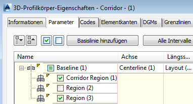 Über das Dialogfeld 3D-Profilkörper-Eigenschaften können Sie Vermessungslinienzüge und Polylinien sowie Achsen und Längsschnitte als Ziele verwenden. Um auf die 3D-Profilkörper-Eigenschaften zuzugreifen, wählen Sie einen 3D-Profilkörper aus, klicken Sie mit der rechten Maustaste, und wählen Sie 3D-Profilkörper-Eigenschaften aus. Das Dialogfeld 3D-Profilkörper-Eigenschaften wird in Abbildung 32 dargestellt.