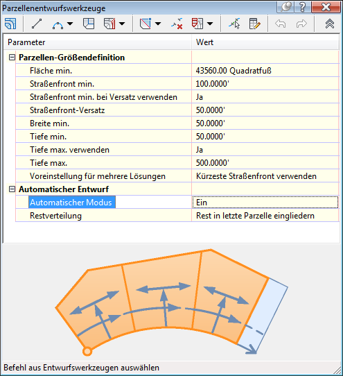 Mit den Werkzeugen für Parzellenlayout können Sie vorhandene Parzellen automatisch oder halbautomatisch teilen. Im automatischen Modus können Sie die Werkzeuge für Parzellenlayout für das automatische Entwerfen verwenden und mehrere neue Parzellen, die den verfügbaren Bereich einnehmen werden, in der Voransicht anzeigen. Wenn Sie den automatischen Modus deaktivieren, entwerfen die Layoutwerkzeuge vorgeschlagene neue Parzellen nacheinander.