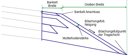 Die Deckschicht des Banketts wird für die vorgegebene Bankettbreite und mit der Vorgabebankettneigung vom Zuordnungspunkt aus nach außen eingefügt. Die Tragschichtverknüpfung wird vom Zuordnungspunkt zu UntereTragschicht Tiefe unterhalb der Deckschicht eingefügt.