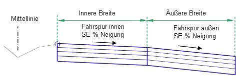Dieser Querschnittsbestandteil erstellt eine Querprofildarstellung einer Fahrbahn mit unterschiedlicher Querneigung der Fahrspuren, bei der die innere Fahrspur eine andere Neigung als die äußere aufweist.