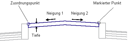 Der Dachprofilpunkt des Mittelstreifens wird durch Schnittlinien berechnet, die sich mit den angegebenen Neigungen zwischen dem Zuordnungspunkt und dem markierten Punkt erstrecken. Wenn kein Schnittpunkt gefunden wird, wird der Mittelstreifen nicht eingefügt. Wenn eine Tiefe ungleich null angegeben ist, wird die Unterkante der Mittelstreifenverknüpfung parallel zur Oberkante eingefügt und vertikale Verknüpfungen werden hinzufügt, um die Profilart zu schließen.
