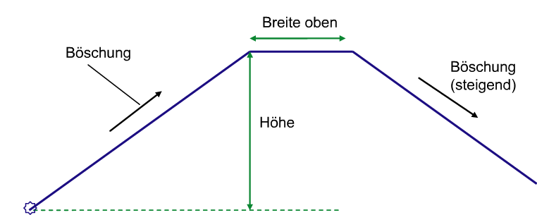 | Böschung (steigend) | Neigung (Verhältnis) der steigenden Böschungsverknüpfung des Lärmschutzwalls | Numerisch |
