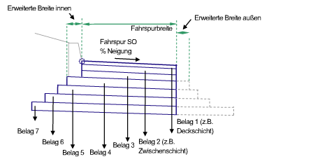 | Belag7 Angabe der Breite | Gibt an, wie die Breite des Belag7 angegeben wird | Zeichenfolge, Kombinationsliste mit folgenden Optionen: Mit höherem Fahrbahnbelag-Layer abgleichen, Breite, Versatz innen-Versatz außen, Versatz innen-Breite | Mit höherem Fahrbahnbelag abgleichen |