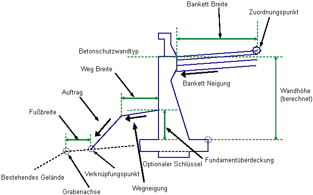 | FundamentÜberdeckung | Die Tiefe der Überdeckung vom oberen Ende des Fundaments bis zur Oberkantenneigungslinie auf der Wandrückseite im Auftrag oder bis zum Ansatz im Abtrag. | Numerisch |