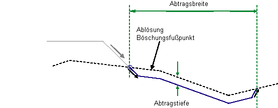 | Böschung | Vorgabeböschung der Abtragserweiterung vom ursprünglichen Böschungsfußpunkt bis zum Anfang der Böschung (steigend) | Numerisch | -2 (:1) |