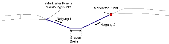 Die Positionen von Zuordnungspunkt und markiertem Punkt werden bestimmt. Der markierte Punkt kann entweder rechts oder links vom Zuordnungspunkt liegen. Verknüpfungen werden bei Neigung 1 vom Zuordnungspunkt und bei Neigung 2 vom markierten Punkt nach innen verlängert, bis sie sich schneiden. Wenn eine Grabenbreite ungleich null angegeben wird, wird eine Verknüpfung für einen ebenen Grabenboden in die sich schneidenden Böschungen eingepasst.