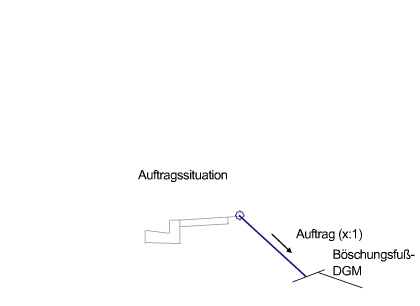 Der Zuordnungspunkt wird geprüft, um festzustellen, ob er sich im Abtrag oder Auftrag befindet. Befindet er sich im Auftrag, wird die Böschungsfußverknüpfung bis zum vorhandenen DGM mit dem vorgegebenen Auftrag verlängert.
