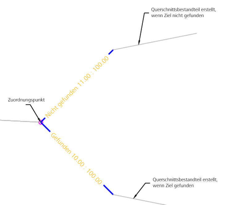 Der Querschnittsbestandteil BedingtHorizontalZiel2 wendet verschiedene Querschnittsbestandteile (z. B. Aufweitung, Bordstein und Rinnstein, Graben oder Böschungsfuß) automatisch auf einen Querschnitt an, abhängig davon, ob an der 3D-Profilkörper-Station ein Versatzziel gefunden wird.