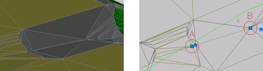 Beachten Sie, dass das Symbol in der ersten Zeile angezeigt wird. Dieses Symbol gibt an, dass die Elementkante der Gebäudefläche auch einen PI an diesem Punkt hat. Wenn zwei Elementkanten an einem gemeinsamen Scheitelpunkt kreuzen, müssen beide Scheitelpunkte denselben Höhenwert teilen. Die Höhe für beide Elementkanten an diesem Punkt wird darüber festgelegt, welche Elementkanten zuletzt bearbeitet wurden. In der folgenden Abbildung befindet sich der gemeinsame Scheitelpunkt in Kreis A.