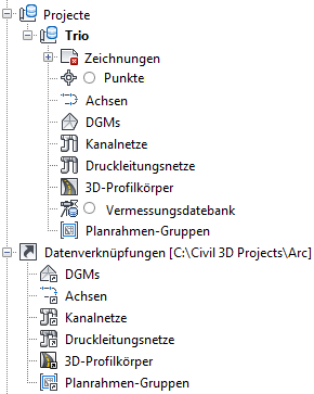 Die Abbildung zeigt die Sammlungen für ein Vault-Projekt namens Trio und ein Datenverknüpfungsprojekt namens Arc. Beide Projekte werden aus der Standard-Projektvorlage erstellt. Folglich enthalten sie identische Sammlungen von DGMs, Achsen und anderen Objekten, die in mehreren Zeichnungen referenziert werden können.