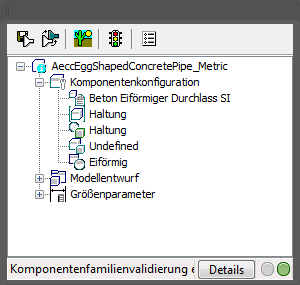 Wenn die parametrische Erstellungsumgebung geöffnet wird, entspricht der oberste Ordner im Komponenten-Browser dem Ordner Komponentenkonfiguration. Bei der Komponentenkonfiguration werden anhand der Domäne (Haltung oder Schacht/Bauwerk), des Typs und des Untertyps die Eigenschaften und das Verhalten der Komponente definiert; die Komponente muss hierfür gespeichert werden. Um sicherzustellen, dass die Komponente ordnungsgemäß validiert und gespeichert werden kann, sollten Sie die Komponentenkonfiguration definieren, bevor Sie mit dem Entwurf der Komponente beginnen.