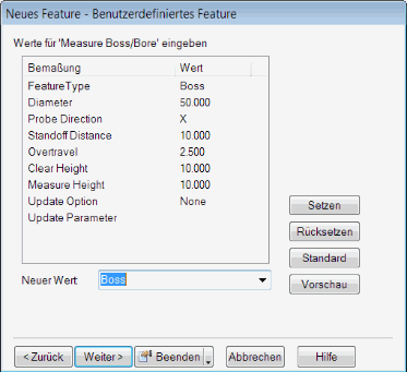 Überfahren — Geben Sie die Distanz vom nominalen Tasterpunkt bis zum Ende des Taster-Anschlags ein oder wählen Sie sie aus.