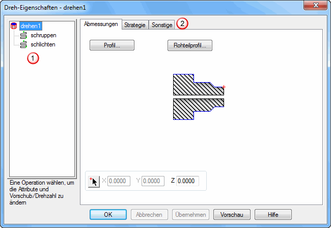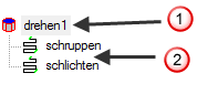 Die Dreh-Feature Baum-Ansicht listet die verschiedenen Operationen für dieses Feature auf: