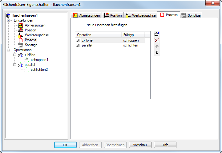Die Registerkarte Prozess listet die Operationen für das Fräsen des Features in der Reihenfolge auf, in der sie erfolgen. Sie können Operationen entfernen, indem Sie diese abwählen. Auf diese Weise können Sie Operationen anpassen und diese dann deaktivieren, um unübersichtliche Bildschirmanzeigen beim Arbeiten an nachfolgenden Operationen zu reduzieren.