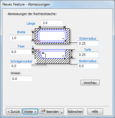 - Wählen Sie die Option Rechtecktasche aus, und klicken Sie auf Weiter, um die Seite Neues Feature - Abmessungen zu öffnen. Geben Sie folgende Attribute ein:
