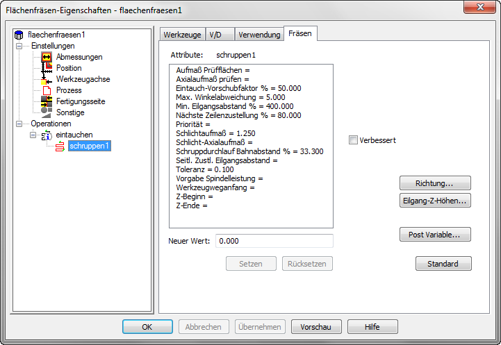 Vorgabe Spindelleistung — Dies ist die für die vorgegebene Breite/Tiefe des Schnitts sowie des Vorschubs optimale Leistung (Pferdestärke) bezüglich des gewählten Materials des Rohteils.