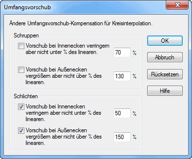 Aktivieren Sie das Kontrollkästchen Vorschub bei Außenecken vergrößern, um den Vorschub bei konkaven Bewegungen zu vergrößern. Legen Sie die Obergrenze fest, indem Sie einen Prozentsatz des linearen Vorschubs eingeben.