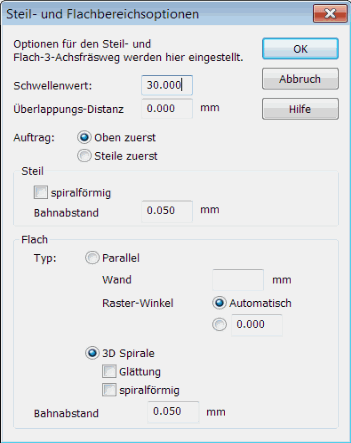 Schwellenwert Winkel — Geben Sie den Winkel der Flächenneigung, gemessen von der Horizontalen, der die Trennung zwischen der Konstante Z (steil) und der flachen Fertigung festlegt.