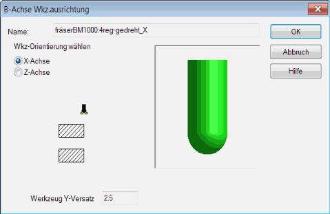 WKZ-Orientierung wählen - Geben Sie an, ob die Werkzeugausrichtung mit der X-Achse, Y-Achse oder B-Achse erfolgen soll.