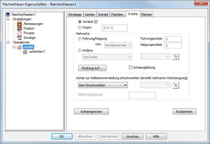 Diese Registerkarte erlaubt es, drei verschiedene Optionen einzustellen: Werkzeugachse, Achse zur Kollisionsvermeidung einschwenken und Achsengrenzen. Die ersten beiden Abschnitte des Dialogs können verwirrend sein, da beide die Neigung der Werkzeugachse steuern. Sie können den ersten Abschnitt, Werkzeugachse, als erste, von Hand gesteuerte Ebene der Werkzeugneigung verstehen. Sie können zur Kollisionsvermeidung dann eine extra Neigung hinzufügen, indem Sie die Achse zur Kollisionsvermeidung einschwenken-Option einsetzen.
