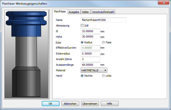 Werkzeugmaterial - Dies gibt das Material an, aus dem das Werkzeug besteht. Diese Informationen sind zum Berechnen von Vorschüben und Drehzahlen erforderlich.