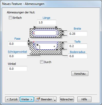 2. Wählen Sie die Option Nut aus, und klicken Sie auf Weiter, um die Seite Neues Feature - Abmessungen zu öffnen.