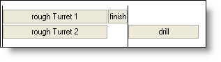 In diesem Beispiel verfügt die Maschine über zwei Werkzeugträger, die Bauteile auf der Hauptspindel schneiden können. Die Hauptspindel besitzt eine Schruppoperation, die simultan auf beiden Werkzeugträgern ausgeführt wird. Die identische Länge der die Schrupp-Operationen umgebenden Kasten zeigt, dass Sie die selbe Zeit zum Schneiden benötigen werden.