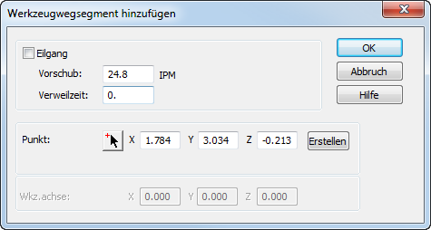 Mit diesem Formular können Sie einen neuen Punkt vor den aktuell ausgewählten Punkt einfügen. Geben Sie für jeden Punkt, den Sie erstellen möchten, die neuen Punkt-Koordinaten ein, legen Sie eine Vorschubrate fest oder wählen Sie die Option Eilgang aus, geben Sie optional eine Verweilzeit in Sekunden ein und klicken Sie auf die Schaltfläche Erstellen. Wenn Sie mit dem Erstellen von Punkten fertig sind, klicken Sie auf OK.