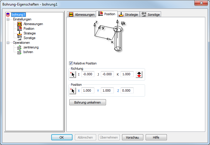 Position: Geben Sie die Koordinaten der Oberseite der Bohrung ein, oder klicken Sie auf Position wählen